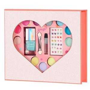 Questo è il regalo perfetto per tutte le piccole makeup artist: un delizioso cofanetto tutto glitterato a forma di cuore che contiene tantissimi ombretti di vario colore, uno smalto e applicatori per il trucco, per essere sempre perfette in ogni occasione.