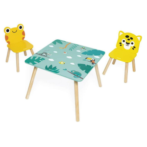 Un tavolino quadrato a tema giungla con due sedie a forma di giaguaro e rana sono troppo dolci e allo stesso tempo comodissime, per arredare la cameretta senza compromessi. Il tavolo è fatto interamente in legno ed è molto leggero, per essere facilmente trasportabile da una stanza all'altra se necessario.