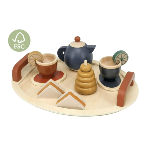 Questo bellissimo set da tè è fatto interamente in legno certificato FSC, ed è completo di tutto il necessario per la merenda insieme alle tue bambole e i tuoi peluche!